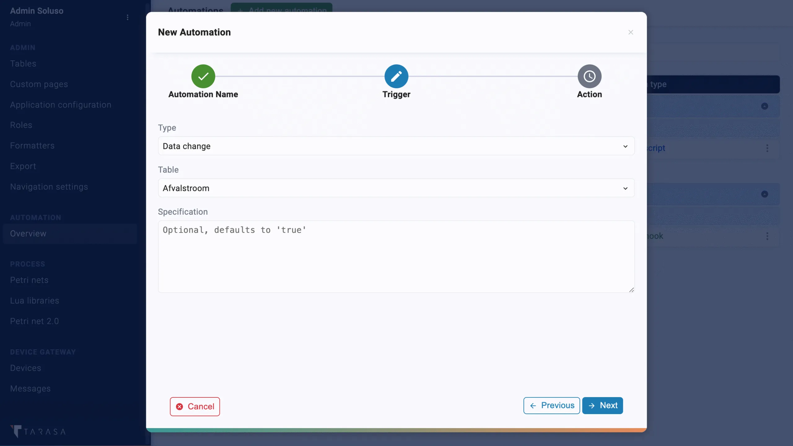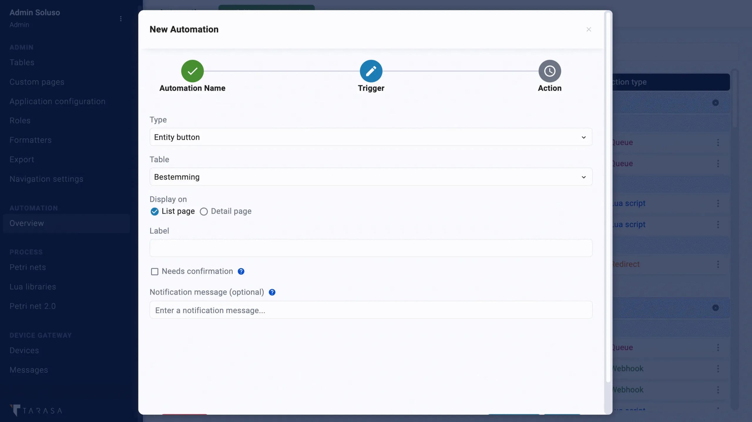 In Tarasa automatiseer je acties en processen binnen je applicatie, zonder dat daar een ontwikkelaar aan te pas hoeft te komen. Met Tarasa stel je zelf triggers, knoppen of tijdsafhankelijke processen in, perfect voor workflows die anders handmatig werk vereisen. Als reseller voeg je hiermee logica toe aan je applicatie, zonder dat je afhankelijk bent van backend development.
