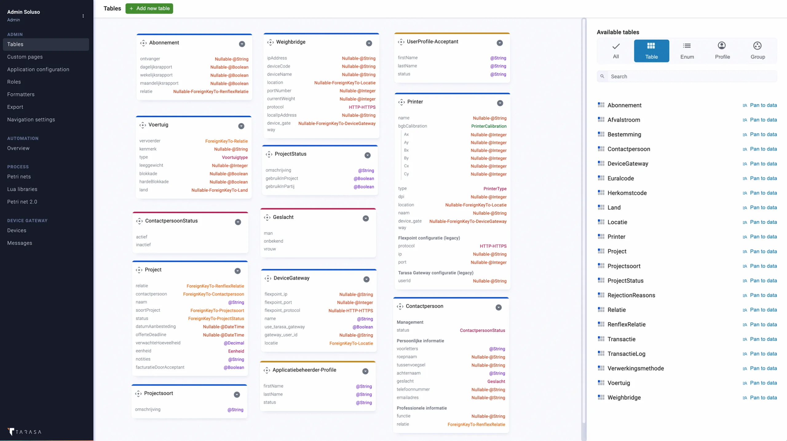 Modelleer tabellen direct in Tarasa met een visuele representatie van relaties en foreign keys. Dit maakt het ontwerpen, begrijpen en aanpassen van de datastructuur snel en overzichtelijk – ideaal bij maatwerk voor eindklanten. Je hoeft geen externe ERD-tools of SQL-scripts te gebruiken: het hele datamodel beheer je centraal in de interface.